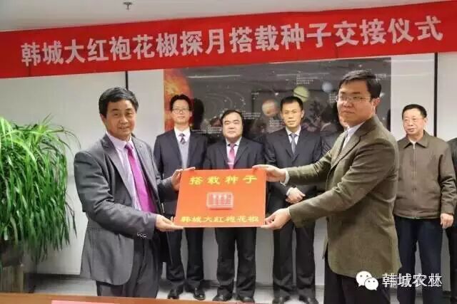 2014年10月24日,韩城大红袍花椒种子成功搭载中国探月工程三期再入返回飞行试验器,经历了近地点高度209公里、远地点高度41.3万公里的地月转移太空遨游后被成功回收。2015年1月7日,中国“韩城大红袍”花椒种子探月搭载交接仪式在北京举行。中国嫦娥奔月航天科技有限责任公司正式向韩城市人民政府交接我国首次探月载入搭载返回飞行实验器中的大红袍花椒种子13.8克和北京方圆公证处开具的公证证书。